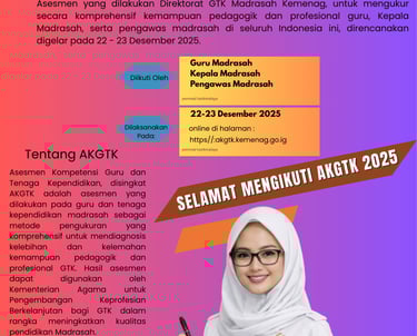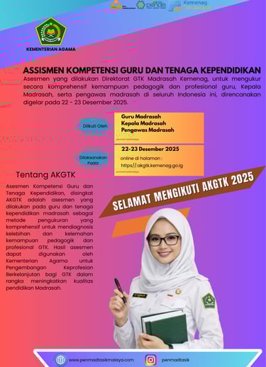 Asesmen Kompetensi Guru dan Tenaga Kependidikan (AKGTK) merupakan cara untuk memetakan kompetensi guru, kepala dan pengawas madrasah sebagai acuan dalam pembinaan dan pengembangan profesi guru, kepala dan pengawas madrasah