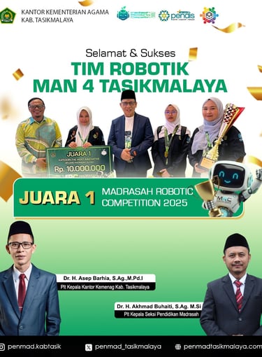 Tasikmalaya – Prestasi gemilang kembali ditorehkan oleh Madrasah Aliyah Negeri (MAN) 4 Tasikmalaya. Tim Robotik MAN 4 Tasikmalaya yang dikenal dengan nama “ROMAP” berhasil meraih Juara 1 Nasional dalam ajang yang diselenggarakan oleh Kementerian Agama