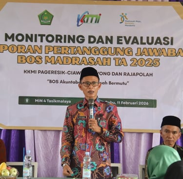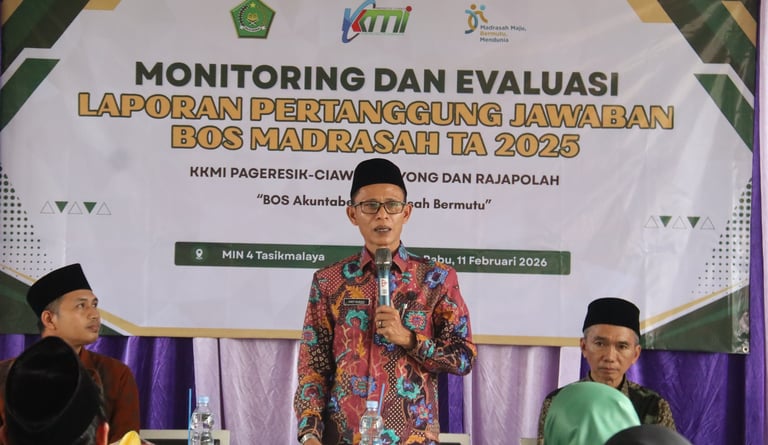 Sukaresik (Kemenag) — Pelaksana Tugas (Plt.) Kepala Kantor Kementerian Agama Kabupaten Tasikmalaya, Dr. H. Asep Barhia, S.Ag., M.Pd.I., bersama Tim Seksi Pendidikan Madrasah melaksanakan kegiatan Monitoring dan Evaluasi (Monev) Laporan Pertanggungjawaban (LPJ) Bantuan Operasional Sekolah (BOS) Madrasah Tahun 2025. Kegiatan tersebut berlangsung di MIN 4 Tasikmalaya dan diikuti oleh seluruh Kelompok Kerja Madrasah (KKM) Pagarresik, Cisayong, dan Rajapolah, Rabu (10/02/2026).