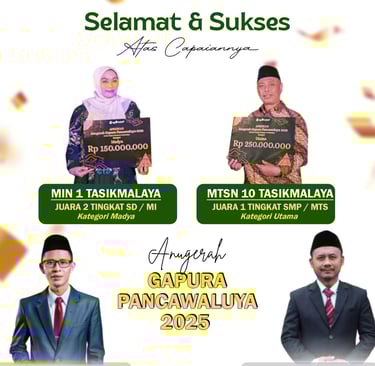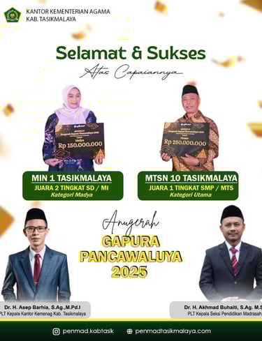 Tasikmalaya 30 Desember 2025— Plt. Kepala Kantor Kementerian Agama Kabupaten Tasikmalaya, Dr. H. Asep Barhia, S.Ag., M.Pd.I, bersama Kepala Seksi Pendidikan Madrasah, Dr. H. Akhmad Buhaiti, S.Ag., M.S.I, menyampaikan ucapan selamat dan apresiasi kepada madrasah di Kabupaten Tasikmalaya yang berhasil meraih prestasi pada ajang Anugerah Gapura Pancawaluya Tingkat Kota/Kabupaten Tahun 2025.